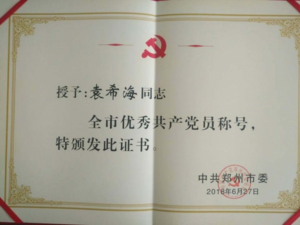 熱烈祝賀公司黨總支組織委員袁希海同志獲得“鄭州市優(yōu)秀共產(chǎn)黨員”榮譽稱號