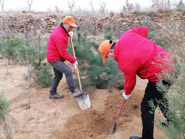栽下棵棵樹苗,留下一片新綠。植樹現(xiàn)場黨旗、司旗、黨小組旗幟在風中迎風飄揚,植樹活動中,一派緊張有序、熱火朝天的勞動景象,大家個個態(tài)度積極、熱情高漲、干勁十足,揮鍬挖坑、運送樹苗、扶植苗木、培實新土、提桶澆灌,大家比干勁、比質量,各個環(huán)節(jié)銜接有序,樣樣做得認真到位,大家樂在其中,配合默契,真正是勁往一處使、汗往一處流,一株株樹苗迎風挺立,展現(xiàn)出勃勃生機。經(jīng)過熱烈有序的植樹勞動,共栽植側柏、油松苗木200余棵,順利完成了義務植樹任務。