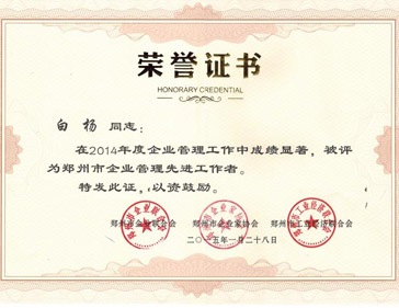 熱烈祝賀我公司白楊同志獲得鄭州市企業(yè)管理先進工作者稱號