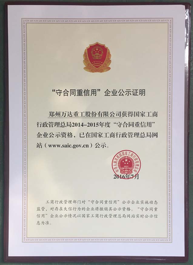 熱烈祝賀鄭州萬達重工股份有限公司榮獲2014-2015年度“國家守合同重信用”企業(yè)