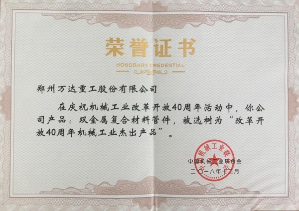 改革開(kāi)放40周年之際,在中國(guó)機(jī)械工業(yè)聯(lián)合會(huì)舉辦的“機(jī)械工業(yè)杰出產(chǎn)品征集及宣傳”活動(dòng)中,鄭州萬(wàn)達(dá)重工股份有限公司“雙金屬?gòu)?fù)合材料管件”被選樹(shù)為“改革開(kāi)放40周年機(jī)械工業(yè)杰出產(chǎn)品”。