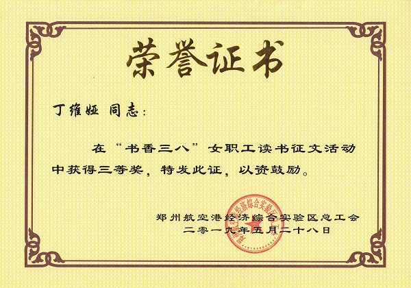 5月28日,鄭州航空港經(jīng)濟(jì)綜合試驗(yàn)區(qū)總工會(huì)下發(fā)表彰通知,在全區(qū)女職工中開展的“逐夢(mèng)新時(shí)代·巾幗綻芳華”為主題的“書香三八”女職工讀書征文活動(dòng)中,我公司員工丁維婭的作品獲得三等獎(jiǎng),并下發(fā)榮譽(yù)證書及鄭州市新華書店購(gòu)書卡以資鼓勵(lì)。