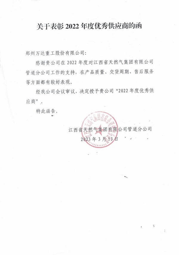 近日,鄭州萬達(dá)重工股份有限公司收到了江西省天然氣集團(tuán)有限公司管道分公司頒發(fā)的2022年度“優(yōu)秀供應(yīng)商”榮譽(yù)獎(jiǎng)牌,獲得該公司2022年度優(yōu)秀供應(yīng)商榮譽(yù)稱號。業(yè)主方對公司所承接彎管項(xiàng)目的產(chǎn)品質(zhì)量、交貨周期、售后服務(wù)等方面給予高度贊揚(yáng)。