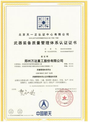 熱烈祝賀鄭州萬(wàn)達(dá)重工股份有限公司獲得《武器裝備質(zhì)量管理體系認(rèn)證證書》