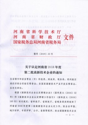 喜訊:鄭州萬(wàn)達(dá)重工股份有限公司被認(rèn)定為河南2018年度高新技術(shù)企業(yè)