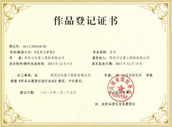 2016/03/04 413 熱烈祝賀鄭州萬達(dá)重工股份有限公司司歌《光榮與夢想》通過河南省版權(quán)局審核,并榮獲河南省版權(quán)局版權(quán)證書。