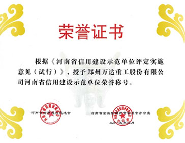 2016/01/28 428 熱烈祝賀鄭州萬達重工股份有限公司通過了河南省信用建設促進會和河南省企業(yè)信用評審委員會辦公室共同組織的河南省信用建設示范單位復審認證,被認定為河南省信用建設示范單位榮譽稱號!