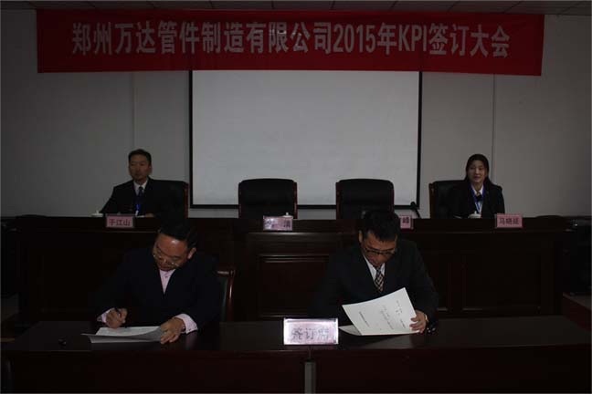 鄭州萬(wàn)達(dá)管件制造有限公司2015年KPI簽訂會(huì)于1月30號(hào)在公司行政區(qū)會(huì)議室隆重舉行,公司班長(zhǎng)以上所有管理人員參加了此次簽訂會(huì)議。簽訂會(huì)分為三級(jí)簽訂,即:董事長(zhǎng)與總經(jīng)理簽訂、總經(jīng)理與公司各高管簽訂、公司各高管與分管的各部門(mén)負(fù)責(zé)人簽訂,近期,各部門(mén)負(fù)責(zé)人將部門(mén)的KPI指標(biāo)進(jìn)行分解,與各班組及相關(guān)崗位簽訂目標(biāo)責(zé)任書(shū),達(dá)到“千斤重?fù)?dān)人人挑,人人肩上有指標(biāo)”的責(zé)任分解領(lǐng)受,確保最終順利完成公司2015年度各項(xiàng)任務(wù)和目標(biāo)。
